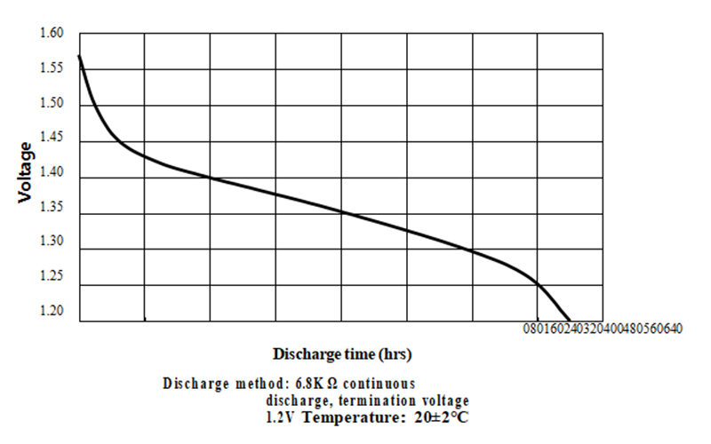 Discharge load: 22kΩ; discharge time: 24 hours/day continuous discharge; termination voltage: 1.2V Note: Prefabricated cells must be tested within 30 days of delivery |