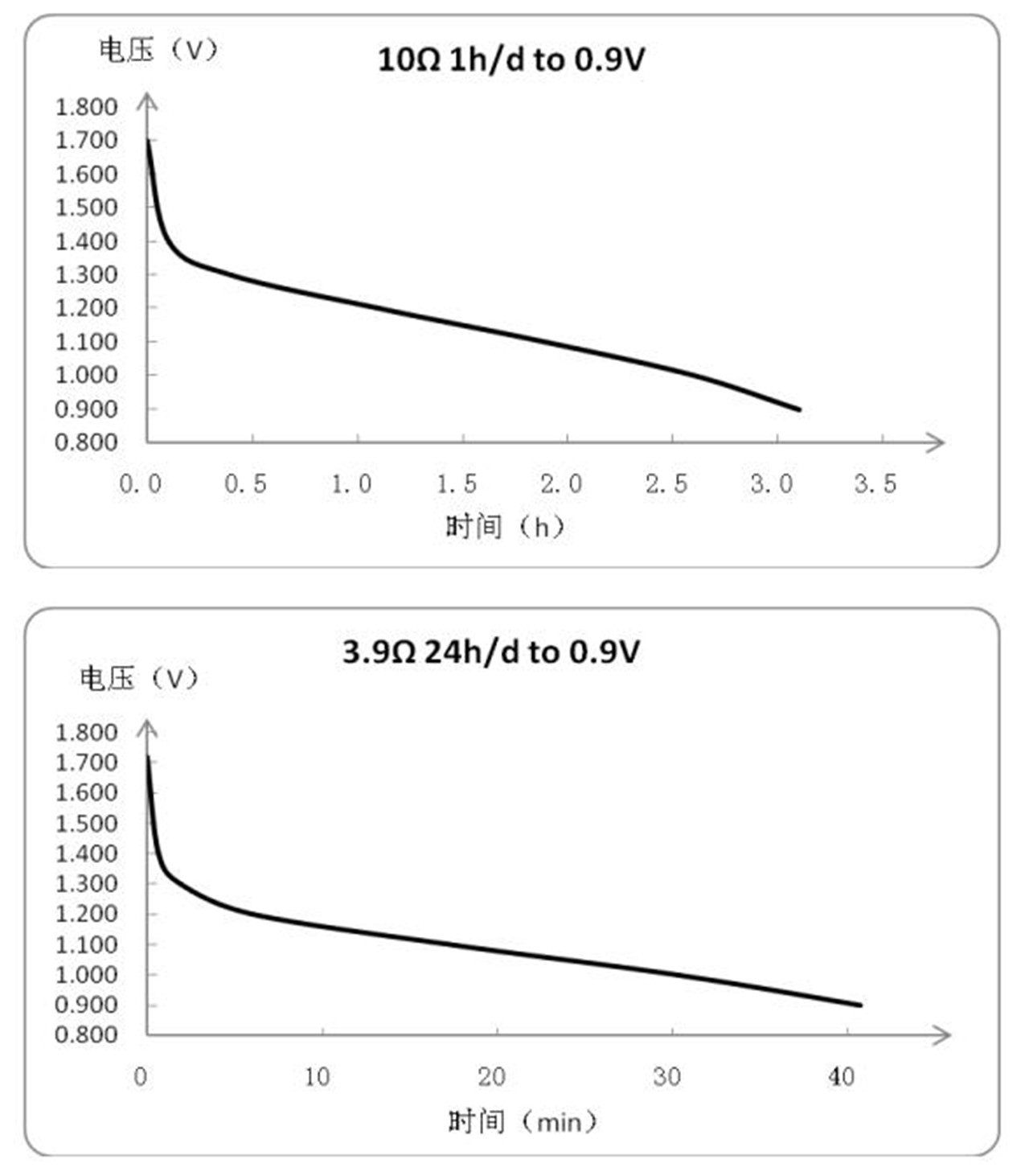 discharge capacity: 300mAh(load 75Ω, 4h/day, 20±2℃, RH60±15%, final voltage 0.9V)